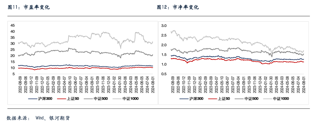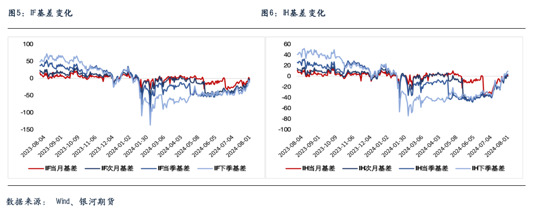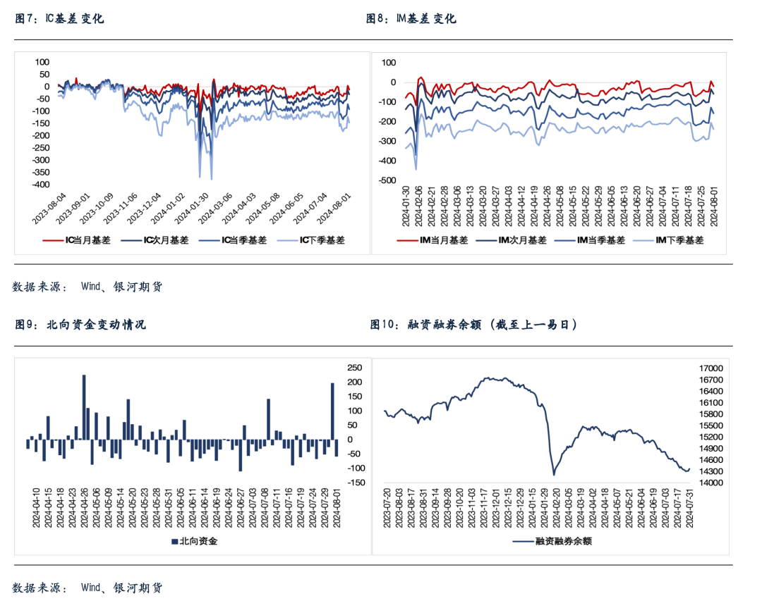 股指期货随现货回落,至收盘,主力成交合约IH2408跌0.71%,IF2408跌0.75%,IC2408跌0.76%,IM2408跌0.34%。期货表现弱于现货,除IH外,各品种基差明显回落。IC、IF、IH和IM成交分别下降23.5%、33.1%、27.4%和21.8%。IC、IF、IH和IM持仓分别3.3%、3.8%、0.9%和3.3%。