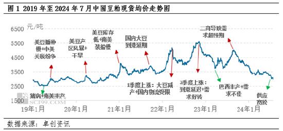 在大豆市场中,美国地位特殊。从全球供需平衡表上看体量庞大:以2023/24年度为例,大豆产量占全球28.66%,仅次于巴西;压榨量占全球18.83%,仅次于中国;出口量占全球26.42%,仅次于巴西。同时不应忽视的是,大豆金融交易主要在芝加哥期货交易所。因此,美豆的金融属性与商品数据,在大豆这个商品中得以较完美体现。从美豆供应端数据看,2023/24年度出现明显的减产,2024/25年度目前有供应能力回归的较强预期。因此从2024年5月份开始,美豆期货开始充分反映这一变化,主力合约5月均价1227美分/蒲式耳,到了7月底已跌至1020美分/蒲式耳附近。