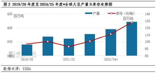 中国豆粕生产原料的较高进口依存度,使得市场参与者不得不去关注国际市场的相关变化。以USDA的7月报告看,2023/24年度中国大豆进口依存度为87.98%,24/25年度为85.89%。从2019/20年度至今的全球大豆产量和库存走势图可以看到,2021/22年度两者开始连续4年增长:产量从2021/22年度的3.61亿吨增加至2024/25年度*的4.22亿吨,库存从2021/22年度的9309万吨增加至2024/25年度*的1.28亿吨,增幅分别是16.9%和37.39%。这与中国豆粕现货价格的转折时间点2022年基本一致。