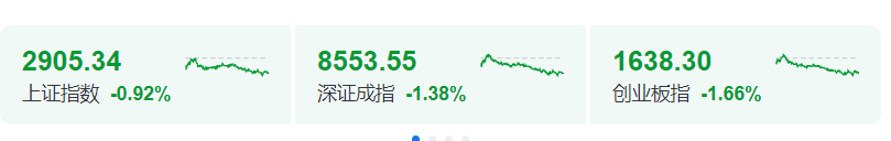 三大指数今日震荡调整,尾盘一度均跌超1%。截至收盘,沪指跌0.92%,深成指跌1.38%,创业板指跌1.66%。