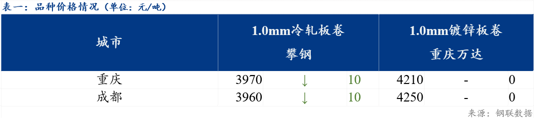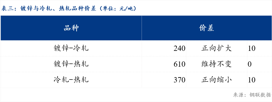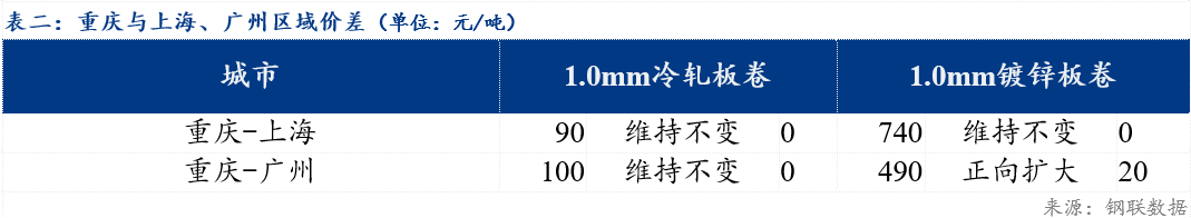 重庆、上海地区冷轧板卷区域价差维持不变,重庆、广州冷轧板卷区域价差维持不变;重庆、上海镀锌板卷区域价差维持不变,重庆、广州镀锌板卷区域价差扩大20元/吨。镀锌、冷轧品种价差扩大10元/吨;镀锌、热轧品种价差维持不变;冷轧、热轧品种价差缩小10元/吨。
