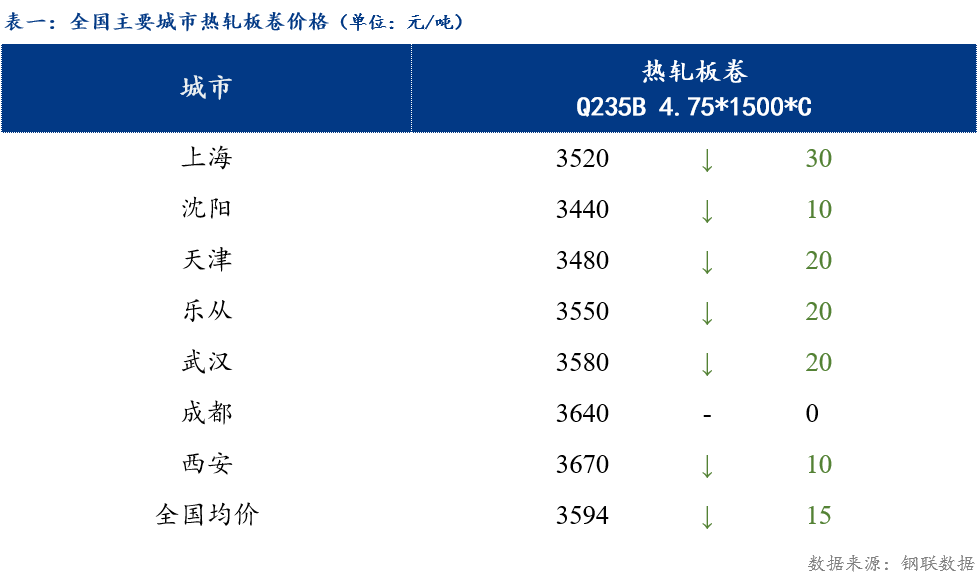 今日热轧板卷全国主要城市价格小幅下跌,截止发稿时3.0mm热轧板卷全国均价3658元/吨,较上个交易日下跌15元/吨。4.75mm热轧板卷全国均价3595元/吨,较上个交易日下跌14元/吨。今日黑色商品期货震荡下行,10合约收跌1.64%,现货价格延续下跌,且跌破上半年低点,市场情绪逐步转弱,整体成交偏弱。