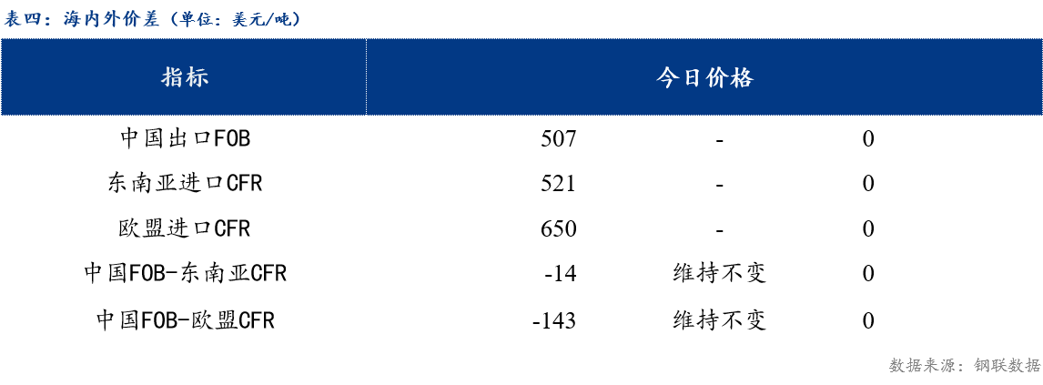 从海内外价差情况来看,中国热卷出口在507美元/吨,较上一交易日持平;欧盟进口价格650美元/吨,较上一交易日持平。