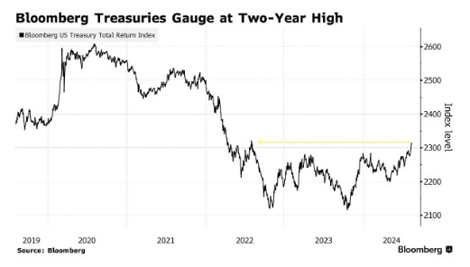 两年期美债即将迎来第四天上涨,收益率跌至2023年5月以来的最低水平。此前,Bloomberg的美国国债指数周四收于两年来的最高水平。本周金价上涨3.3%,接近7月中旬创下的历史高点。
