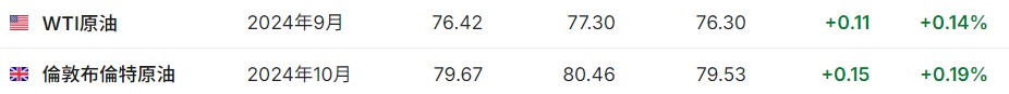 3. 截至发稿,WTI原油涨0.14%,报76.42美元/桶。布伦特原油涨0.19%,报79.67美元/桶。