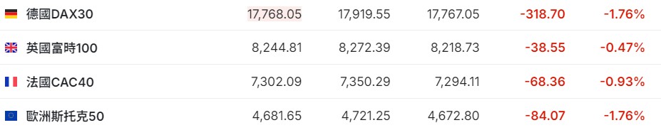 2. 截至发稿,德国DAX指数跌1.76%,英国富时100指数跌0.47%,法国CAC40指数跌0.93%,欧洲斯托克50指数跌1.76%。