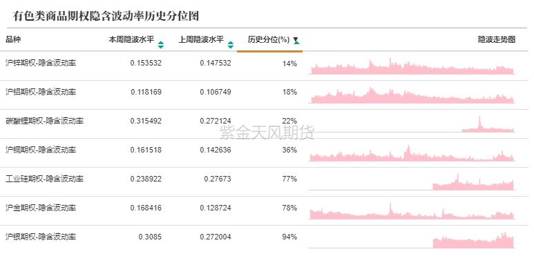 隐含波动率回顾:本周有色类商品期权各个品种主力合约隐含波动率,大多处于较低历史区间。