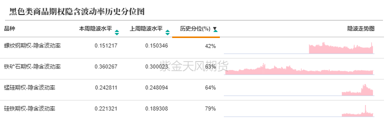 隐含波动率回顾:本周黑色类商品期权各个品种主力合约隐含波动率,大多处于较高历史区间。