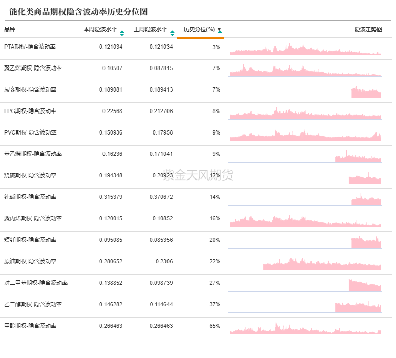 隐含波动率回顾:本周能化类商品期权各个品种主力合约隐含波动率,大多处于较低历史区间。