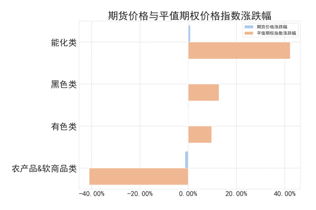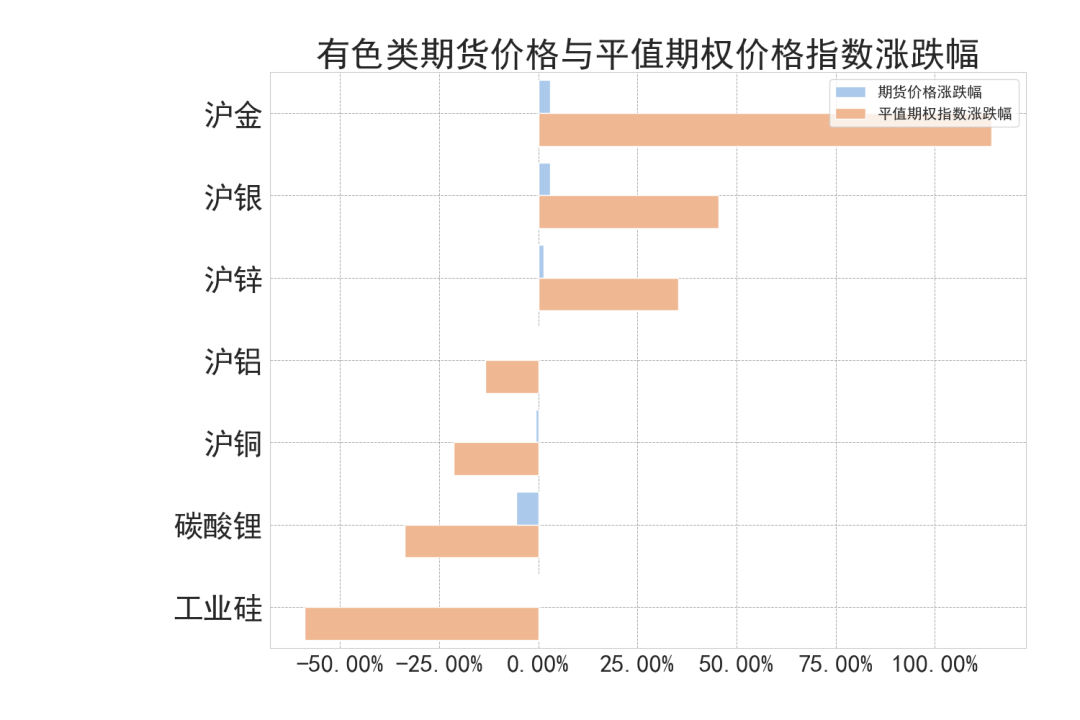 标的价格&平值期权价格指数:有色类期货价格波动不一,沪金涨幅为:2.99%,沪银涨幅为:2.92%。沪铝跌幅为:0.16%,沪铜跌幅为:0.61%。平值期权价格指数方面,沪金较上周有较大涨幅,涨幅为:114.33%,沪银较上周有较大涨幅,涨幅为:45.50%沪铝较上周有较大跌幅,跌幅为:13.33%,沪铜较上周有较大跌幅,跌幅为:21.35%;