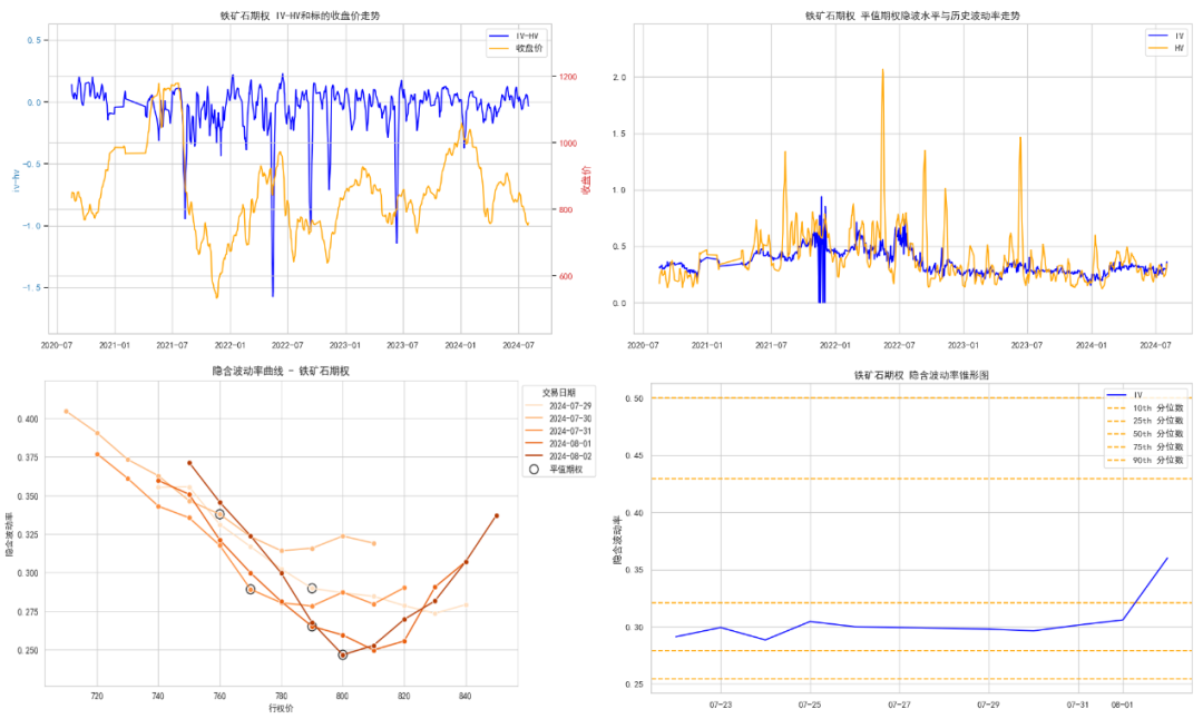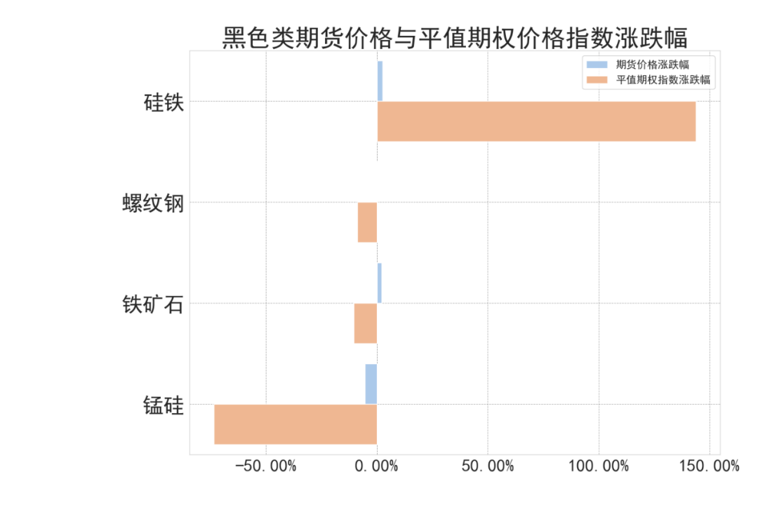标的价格&平值期权价格指数:黑色类期货价格波动不一,硅铁涨幅为:2.46%,铁矿石涨幅为:2.05%。锰硅较上周有较大跌幅,跌幅为:5.39%。平值期权价格指数方面,硅铁较上周有较大涨幅,涨幅为:143.90%螺纹钢较上周有较大跌幅,跌幅为:8.90%,铁矿石较上周有较大跌幅,跌幅为:10.39%;