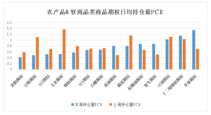 市场情绪方面:本周日均持仓量PCR指标中,农产品&软商品期权指标涨跌不一,市场多空情绪分化明显。菜粕期权本周持仓量PCR数值为0.42,市场短期看空情绪较强;苹果期权本周持仓量PCR数值为1.34,市场短期看多情绪较强;
