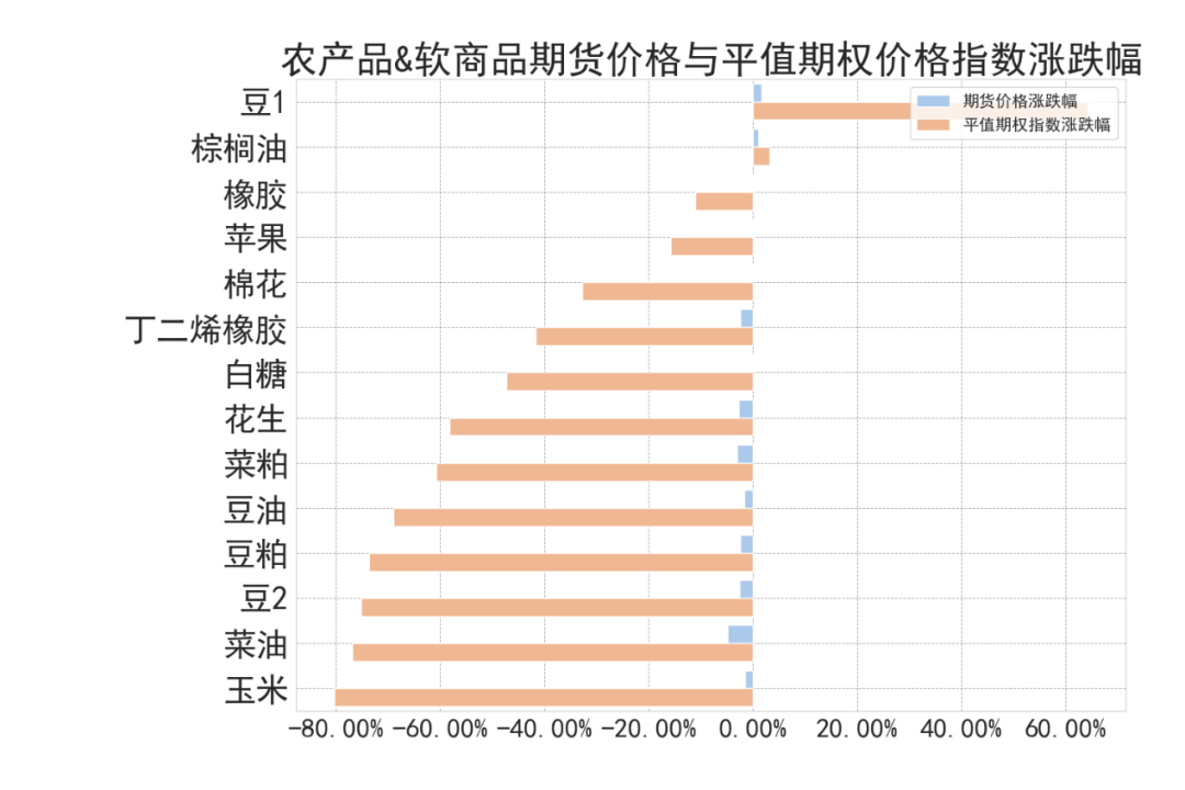 标的价格&平值期权价格指数:农产品&软商品期货价格波动不一,豆1涨幅为:1.61%,棕榈油涨幅为:1.12%。白糖跌幅为:0.23%,玉米跌幅为:1.53%。平值期权价格指数方面,豆1较上周有较大涨幅,涨幅为:64.29%,棕榈油涨幅为:3.12%橡胶较上周有较大跌幅,跌幅为:11.11%,苹果较上周有较大跌幅,跌幅为:15.73%;