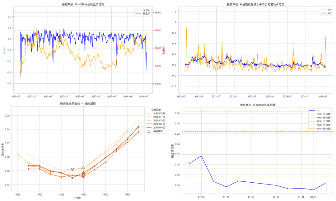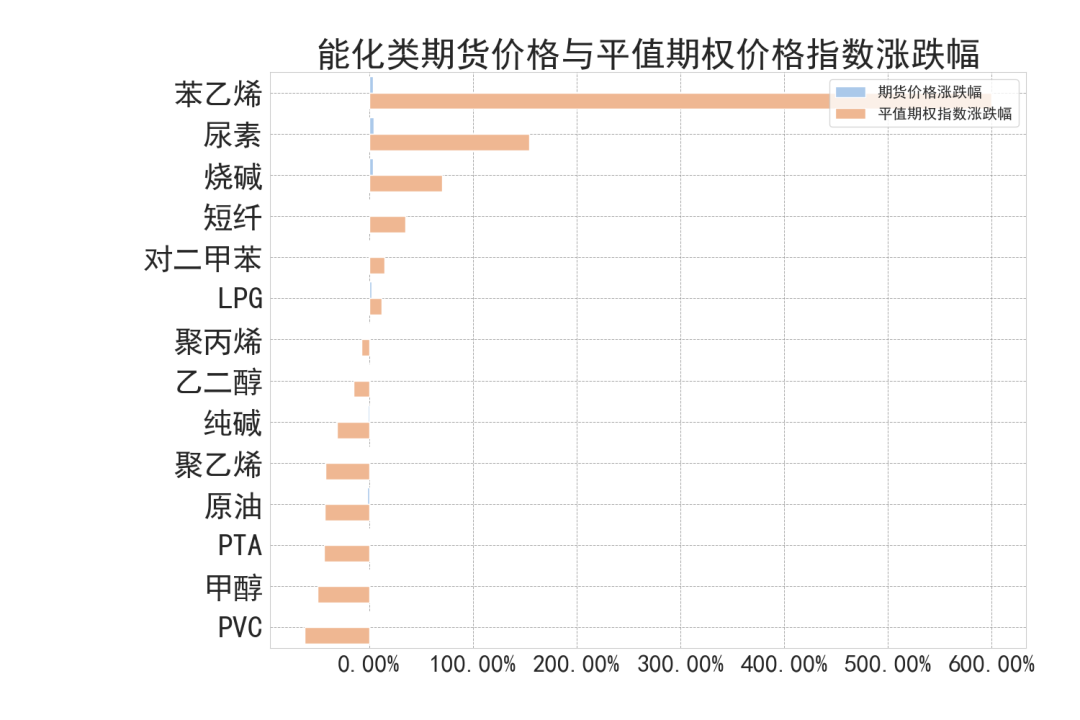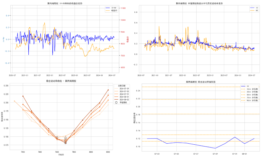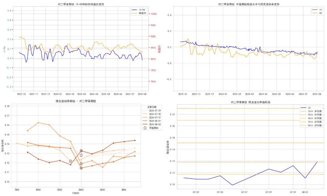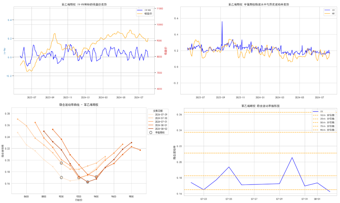 标的价格&平值期权价格指数:能化类期货价格波动不一,尿素涨幅为:4.56%,苯乙烯涨幅为:3.97%。甲醇跌幅为:0.36%,对二甲苯跌幅为:0.38%。平值期权价格指数方面,苯乙烯较上周有较大涨幅,涨幅为:600.00%,尿素较上周有较大涨幅,涨幅为:154.55%聚丙烯较上周有较大跌幅,跌幅为:7.14%,乙二醇较上周有较大跌幅,跌幅为:15.38%;