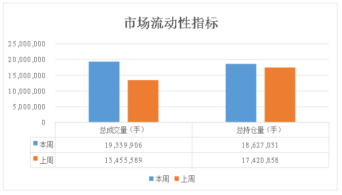 商品期权市场总成交量:本周主力商品期权合约成交量约为13,455,589手,相比上周13,987,099手,下降3.8%。