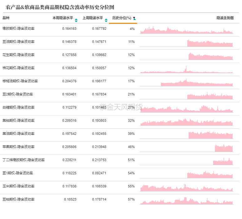 隐含波动率回顾:本周农产品&软商品类商品期权各个品种主力合约隐含波动率,大多处于较低历史区间。