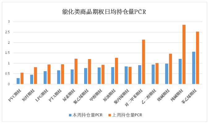 市场情绪方面:本周日均持仓量PCR指标中,能化类商品期权指标涨跌不一,市场多空情绪分化明显。PVC期权本周持仓量PCR数值为0.29,市场短期看空情绪强烈;苯乙烯期权本周持仓量PCR数值为1.56,市场短期看多情绪强烈;