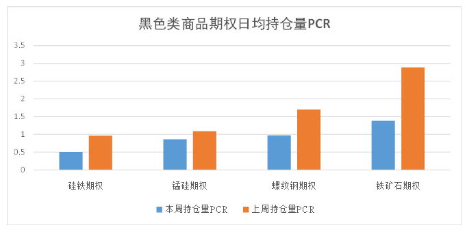 黑色类商品期权:本周日均持仓量PCR指标中,黑色类商品期权指标均有不同程度下跌。硅铁期权本周持仓量PCR数值为0.50,市场短期看空情绪较强;锰硅期权本周持仓量PCR数值为0.86,螺纹钢期权本周持仓量PCR数值为0.98,期货价格可能出现短期震荡局面;铁矿石期权本周持仓量PCR数值为1.38,市场短期看多情绪较强。