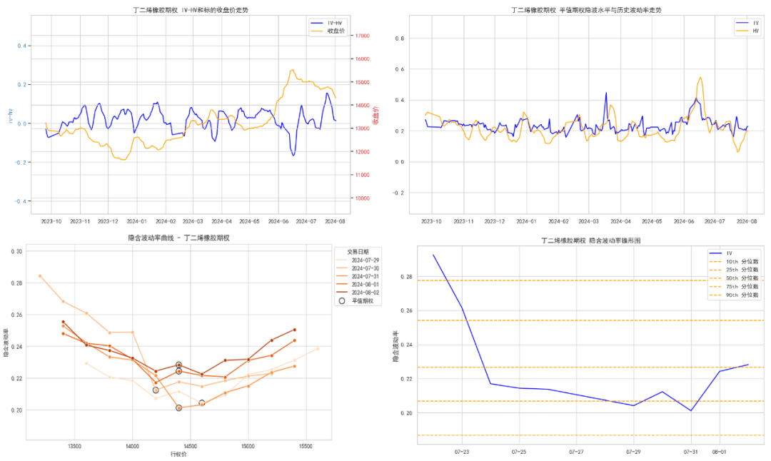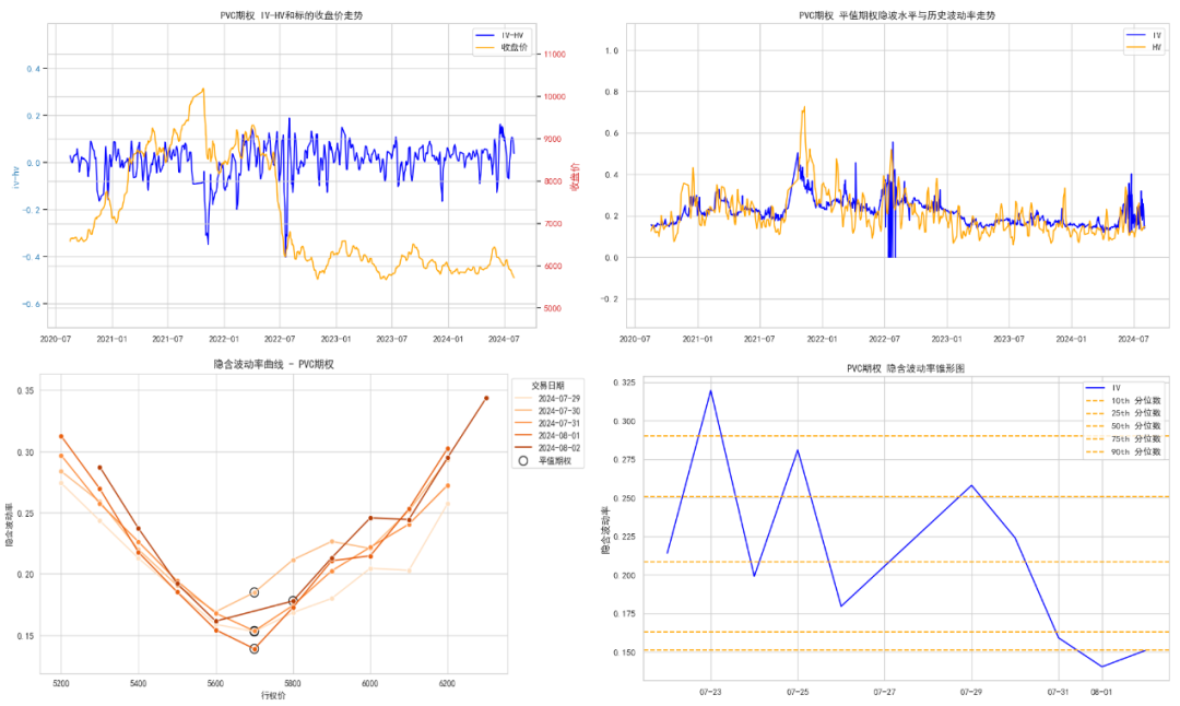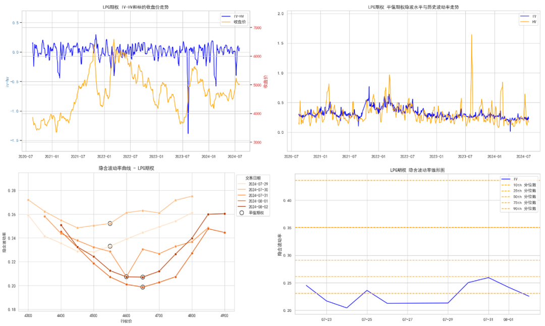 能化类商品期权:本周能化类商品期权各个品种主力合约隐含波动率,大多处于较低历史区间。尿素期权隐含波动率历史分位数为7%,聚乙烯期权隐含波动率历史分位数为7%,LPG期权隐含波动率历史分位数为8%,苯乙烯期权隐含波动率历史分位数为9%,PVC期权隐含波动率历史分位数为9%,烧碱期权隐含波动率历史分位数为12%,PTA期权隐含波动率历史分位数为3%,纯碱期权隐含波动率历史分位数为14%,聚丙烯期权隐含波动率历史分位数为16%,短纤期权隐含波动率历史分位数为20%,原油期权隐含波动率历史分位数为22%,对二甲苯期权隐含波动率历史分位数为27%,处于较低历史区间。根据波动率均值回归角度判断,可以关注隐含波动率后续向历史均值的回归。