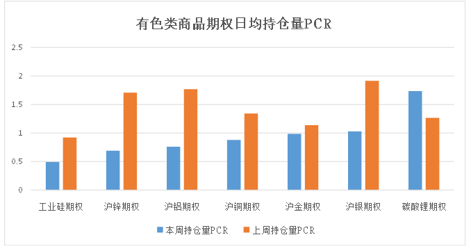 市场情绪方面:本周日均持仓量PCR指标中,有色类商品期权指标涨跌不一,市场多空情绪分化明显。工业硅期权本周持仓量PCR数值为0.49,市场短期看空情绪较强;碳酸锂期权本周持仓量PCR数值为1.73,市场短期看多情绪强烈;
