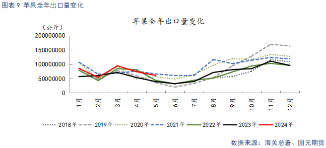 据海关总署数据显示,24年1-5月,我国苹果累计出口量为36.8万吨,较去年同比上涨30.96%。同比增幅明显,在历年出口数据中处于较高水平。主要是适合出口的货源价格持续走弱,成本优势明显。今年以来,我国苹果出口数据表现亮眼,不过我国每年出口量占总产能的比例在2-3%左右,鲜果消费主要还是依靠内需,在内需低迷的大背景下,外贸向好对苹果支撑力度有限。
