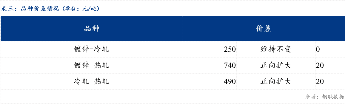 品种价差来看,现镀冷价差为250元/吨,较上一交易日维持不变;镀热价差为740元/吨,较上一交易日正向扩大20元/吨;冷热价差为490元/吨,较上一交易日正向扩大20元/吨。