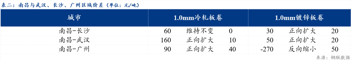 区域价差来看,冷轧品种,南昌-长沙现价差为60元/吨,较上一交易日维持不变;南昌-武汉现价差为160元/吨,较上一交易日正向扩大10元/吨;南昌-广州现价差90元/吨,较上一交易日正向扩大40元/吨。镀锌品种,南昌-长沙现价差30元/吨,较上一交易日正向扩大20元/吨;南昌-武汉现价差为50元/吨,较上一交易日正向扩大20元/吨;南昌-广州现价差为-270元/吨,较上一交易日反向缩小50元/吨。