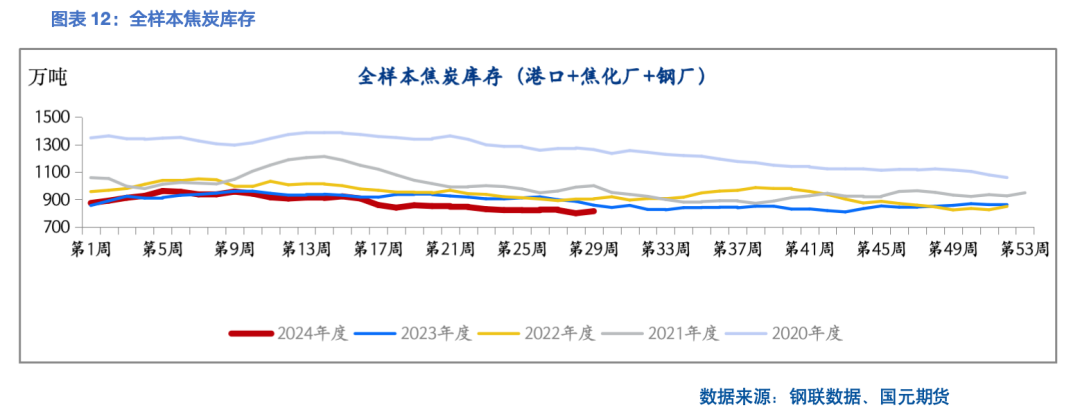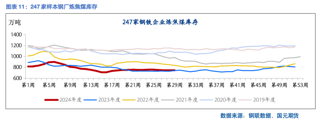 上游矿山焦煤库存继续累库,上周523家样本矿山原煤库存374.36万吨,环比增10.09万吨;精煤库存290.7万吨,环比增加15.69万吨。110家样本洗煤厂精煤库存158.54万吨,环比增加1.34万吨。下游方面,钢厂及独立焦化厂焦煤基本持平。