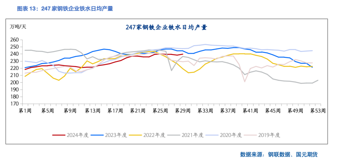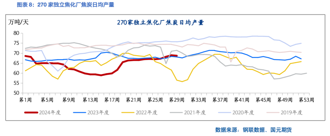 目前吨焦平均利润仍处于盈利区间,但期货盘面利润已经明显下滑,焦炭后市有提降预期。上周,30家独立焦企吨焦利润环比下降2元/吨至33元/吨。目前焦企产量维持高位,库存低位累库。上周,钢厂与独立焦化企业日均焦炭周环比基本持平,钢厂焦炭库存明显累库。