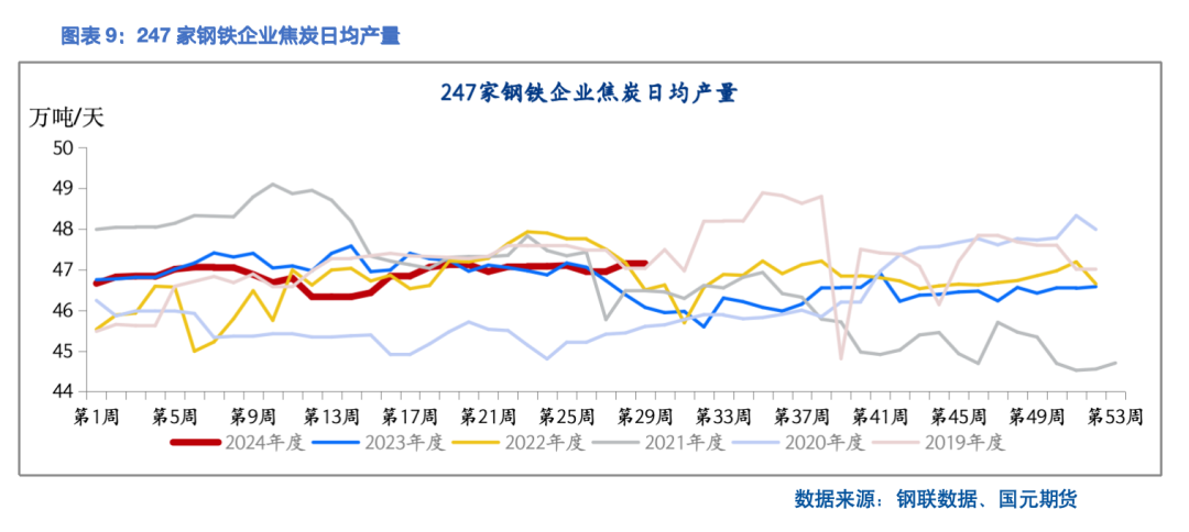 供应方面,重大会议结束,国内矿产量回升,蒙煤进口恢复至正常水平。焦炭产量维持高位。需求方面,铁水维持高位,市场存在刚需。但是市场竞拍走弱,螺纹钢新旧国标切换,引发市场悲观情绪。钢厂利润加速下滑,焦炭后市存在提降预期。