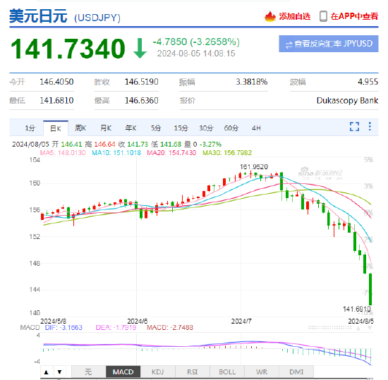 8月5日,美元兑日元日内大跌超3%,逼近140关口。