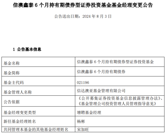 信澳鑫泰6个月持有期债券增聘基金经理杨彬