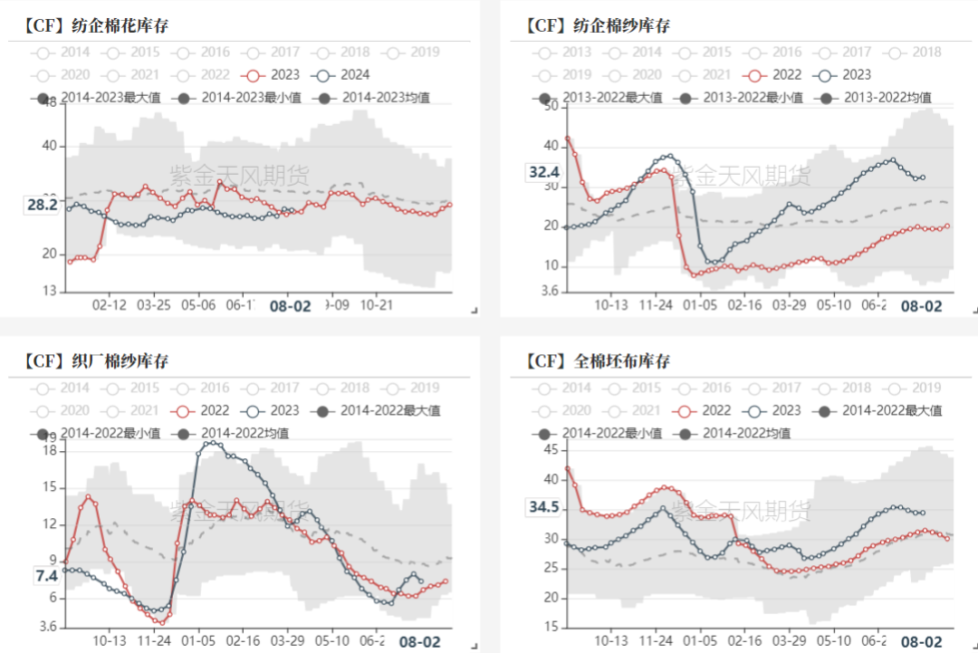 截至8月2日,纺纱厂原料库存为28.2天,成品库存32.4天,纺企去库再次走缓。