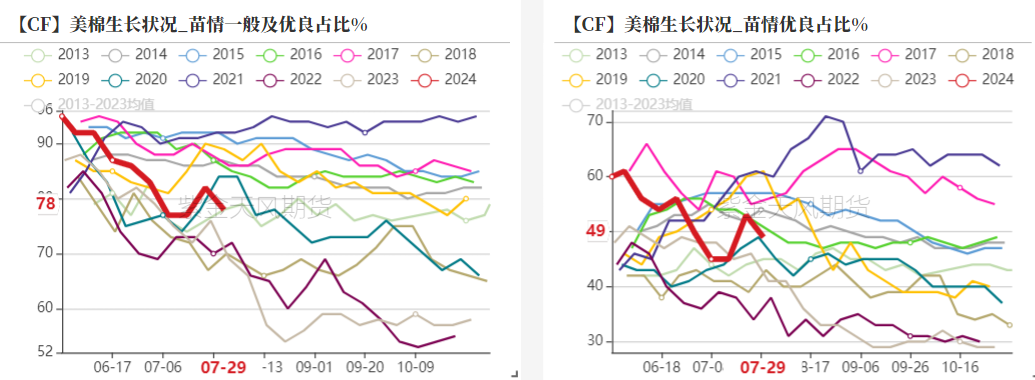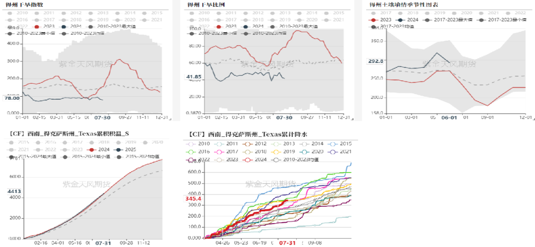 截止到7月30日,美棉主产区(92.8%)的干旱程度和覆盖率指数64,同比低35,环比上周降15;德克萨斯州的干旱程度和覆盖率指数为78,同比低78,环比上周降3。美棉主产区干旱指数继续大幅下探,得州地区干旱水平较去年显著降低。