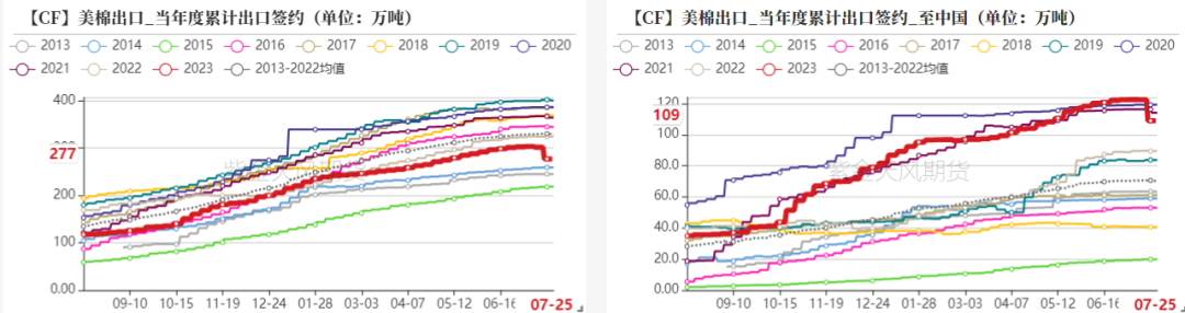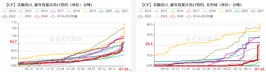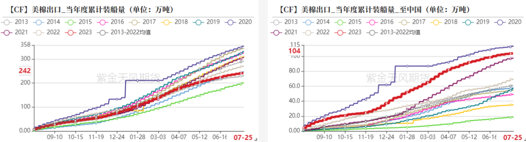 截止7月25日当周,2023/24美陆地棉周度取消签约24.63万吨,取消签约量骤增22.95万吨,较前四周平均水平降3645%;其中中国取消签约13.55万吨,巴基斯坦8.37万吨;(排除年度末结转的影响,本周美棉签约净增6.1万吨,环比增27%,其中中国1.2万吨,整体签约表现环比在好转)