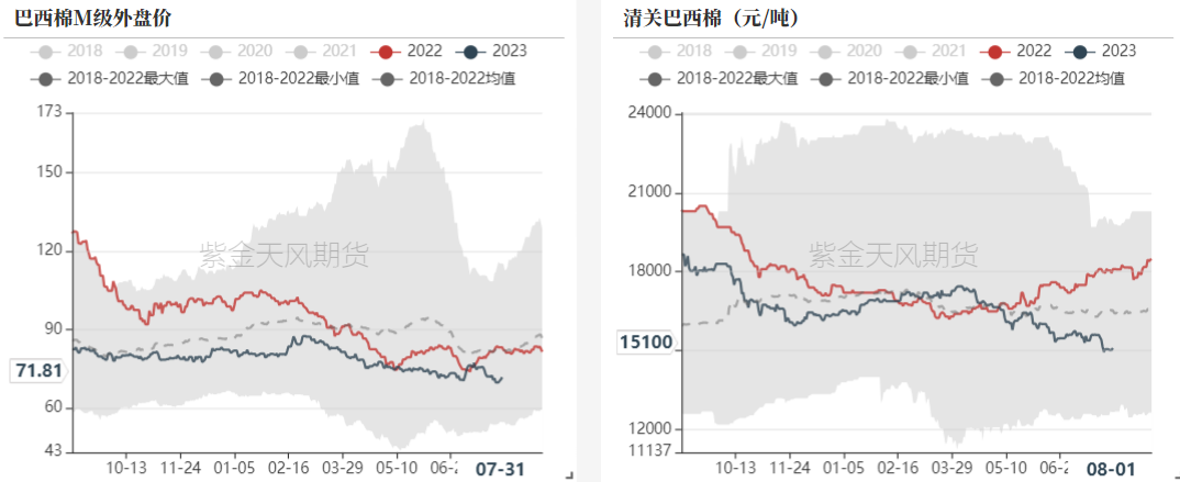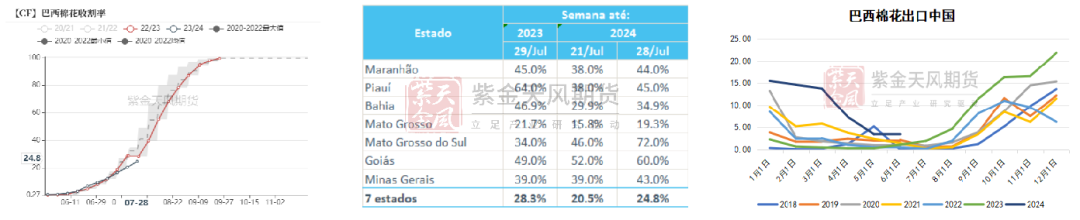 截止7月28日当周,巴西(98.5%)棉花总的收割进度为24.8%,环比增加4.35个百分点,较去年同期慢3.5个百分点。