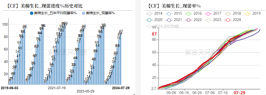 截至当周,美国棉花现蕾率为87%,上一周为81%,上年同期为84%,五年均值为84%。