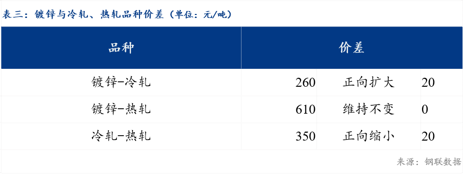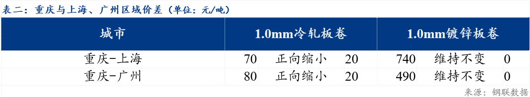 重庆、上海地区冷轧板卷区域价差缩小20元/吨,重庆、广州冷轧板卷区域价差缩小20元/吨;重庆、上海镀锌板卷区域价差维持不变,重庆、广州镀锌板卷区域价差维持不变。镀锌、冷轧品种价差扩大20元/吨;镀锌、热轧品种价差维持不变;冷轧、热轧品种价差缩小20元/吨。