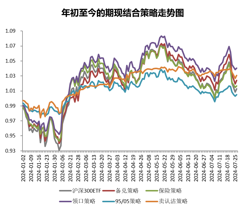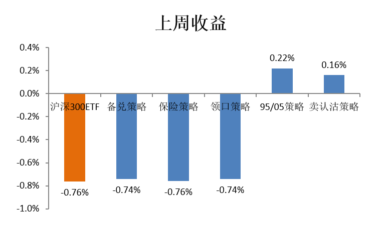 我们对期现结合的五个策略(备兑、保险、领口、95/05配置、卖认沽)及沪深300ETF现货,在上周(2024.7.29-2024.8.2)的表现进行了回测。上周沪深300ETF现货微跌,保险策略和领口策略所持期权已止盈平仓,95/05策略和卖认沽策略表现较好。具体结果如下:
