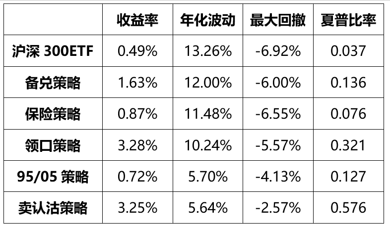 年初至今,现货逐步企稳,领口策略和卖认沽策略表现较好。五个策略的具体表现如下: