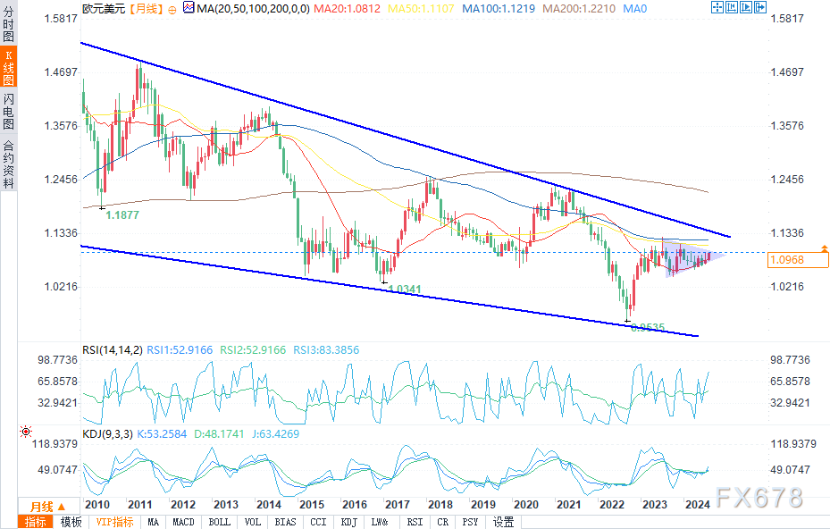 疲软的美元推动了欧元/美元的看涨走势。该图表还显示了一个下降楔形形态,从2008年的峰值1.6038美元到2022年的底部0.9538美元。从2022年底部的强劲反弹,导致欧元/美元在1.14美元左右的长期阻力位附近出现看涨逆转。