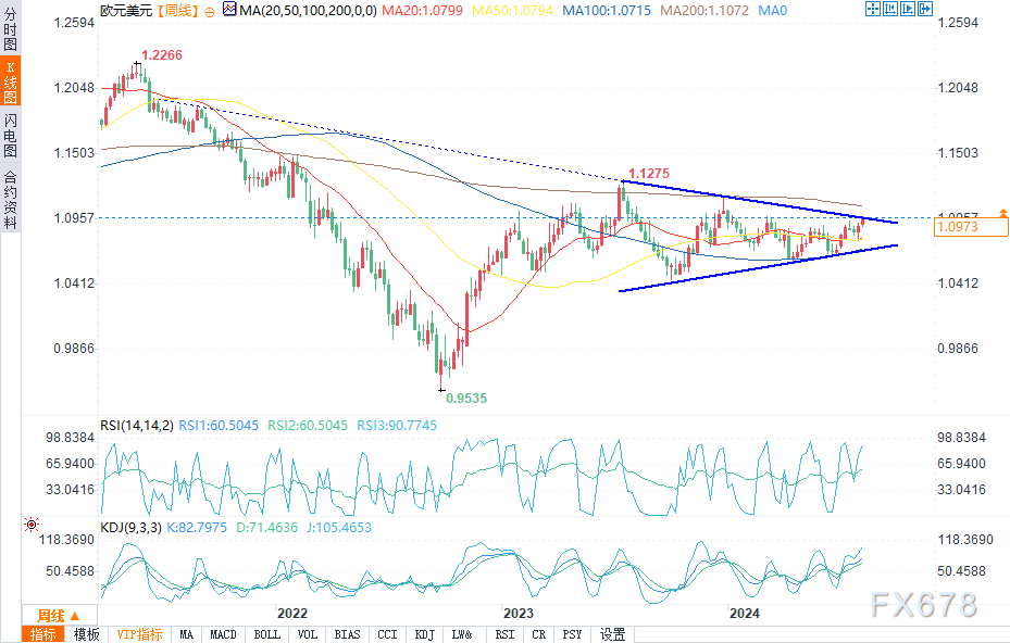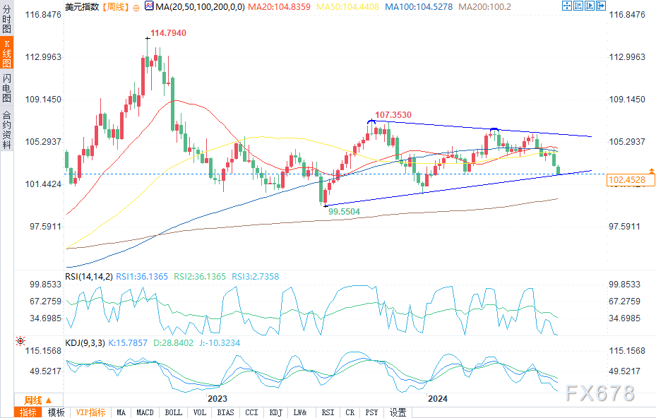 来自美国的疲弱经济数据已经将美元指数拉低到一个可能会做出关键决定的重要区域。跌破该区域可能导致美元指数大幅下跌,欧元/美元强势反弹。从2023年最后一个季度到2024年7月,这一重要区域形成了一个三角形。在114.75的峰值之后,这个三角形的出现暗示了看跌的含义,因为这个三角形也被称为空头信号。双顶部107.05和106.38也表明看跌模式。周收盘价低于102可能会引发美元指数的强势下跌。
