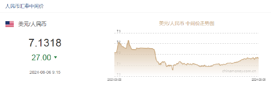 8月6日,人民币中间价报7.1318,上调27点,上一交易日中间价报7.1345。