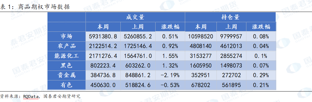 过去一周,商品期权市场成交量继续小幅上涨,能源化工和黑色板块期权交易量上涨较大,贵金属板块期权成交量回落。全板块的期权持仓量略有上涨,大商所和广期所期权近月合约下周三到期,持仓或将逐渐换月,可关注铁矿石、棕榈油和豆粕以及碳酸锂期权在到期日附近增量带来的交易机会。