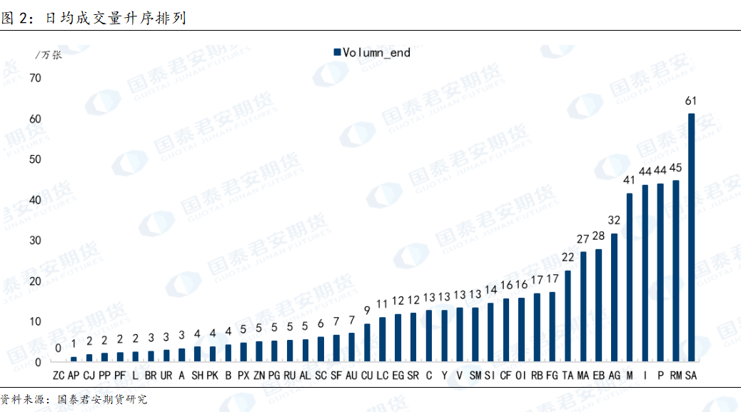 纯碱和棕榈油期权在增量之后总交易量排名靠前。由于玻璃纯碱在过去一周价格波动放大,期权交易量随之增加,目前玻璃价格处于相对低位,且现货成交出现阶段性回升,盘面表现出止跌迹象,但玻璃行业长期高产量、高库存,且近年来地产新开工持续下滑可能继续导致玻璃需求的下滑,因此使用期权交易该板块价格止跌反弹的安全性较高,可继续关注。