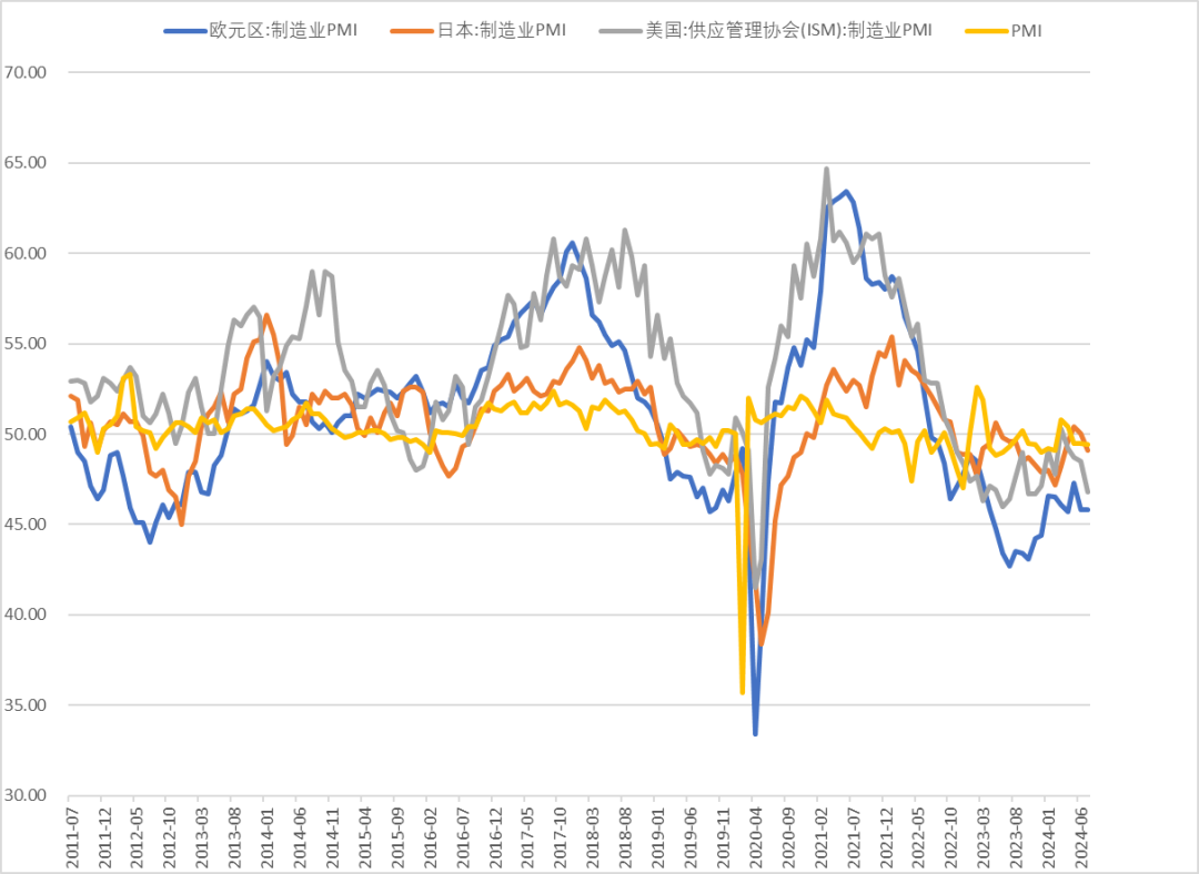 7月全球PMI数据全面下行,美国PMI跌到46.8%,远低于市场预期,日本跌到49.1%,中国PMI连续三个月低于50%,欧洲PMI继续垫底。
