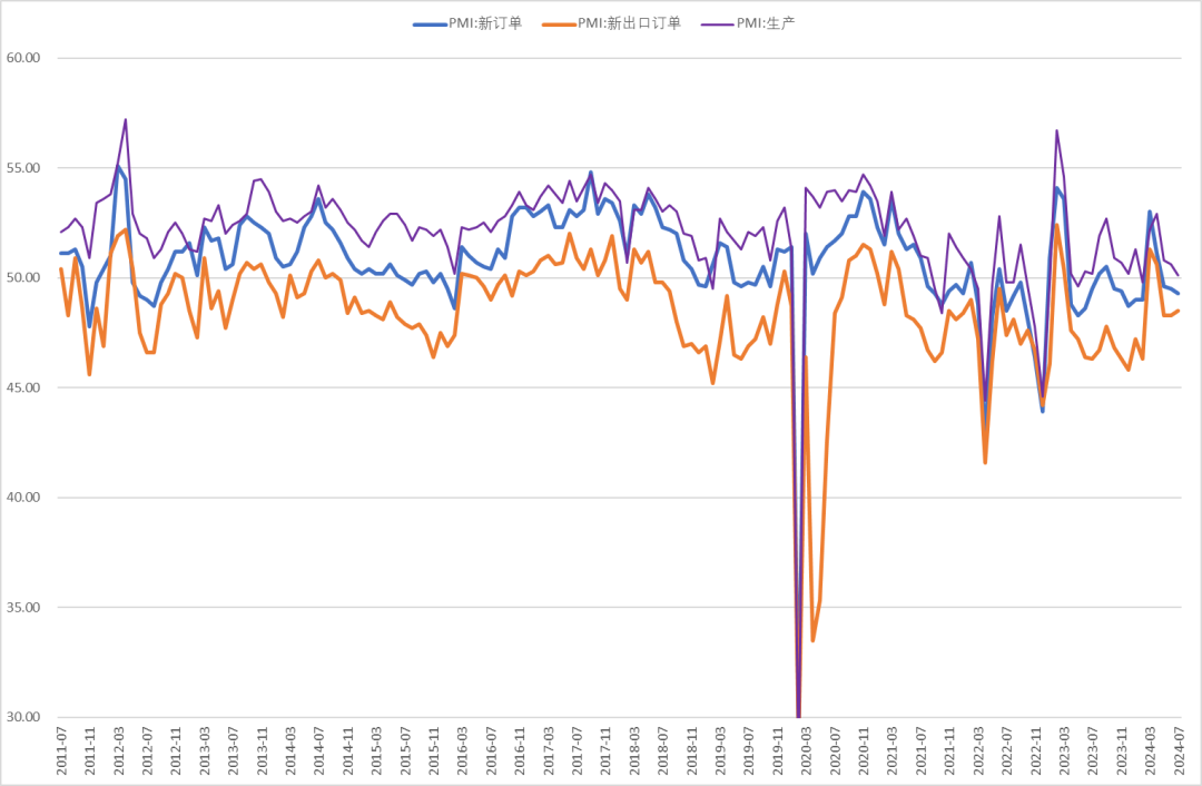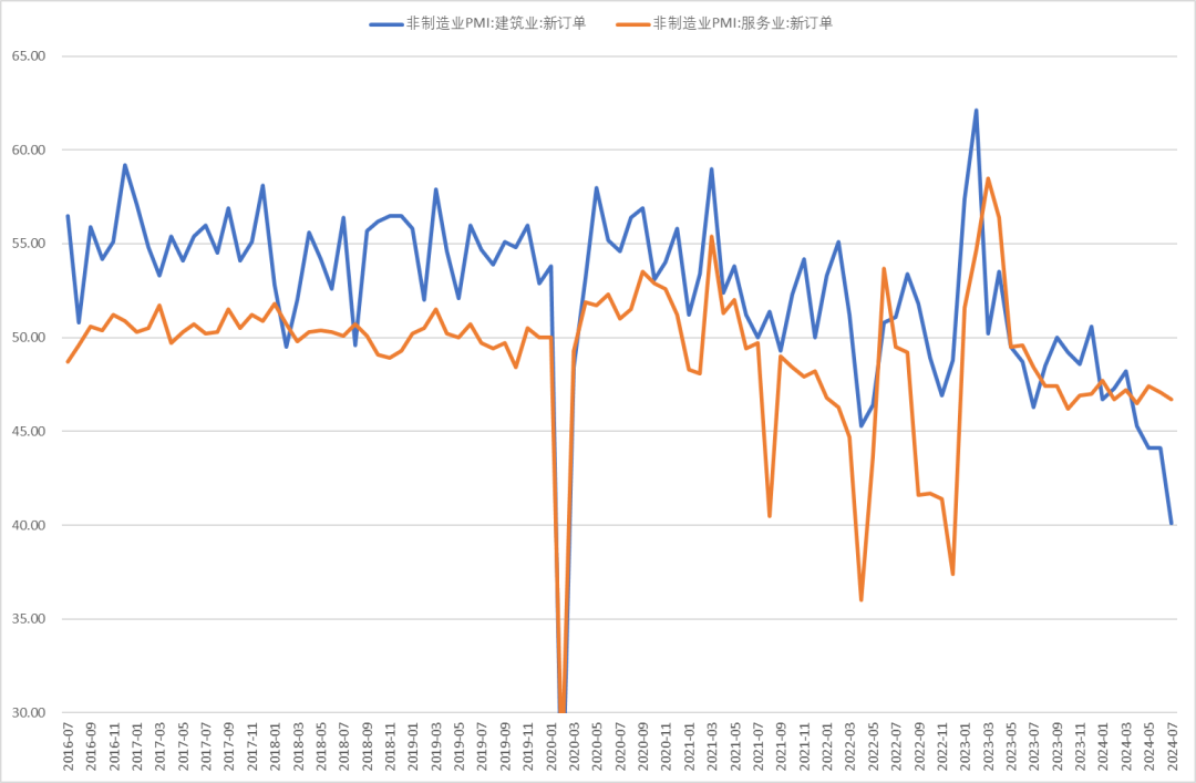 从结构上看制造业新订单指数为49.3%,比上月下降0.2个百分点,需求继续回落,价格指数有所下降。受市场需求不足和近期部分大宗商品价格下降等因素影响,主要原材料购进价格指数和出厂价格指数分别为49.9%和46.3%,比上月下降1.8和1.6个百分点。非制造业新订单继续收缩,受高温暴雨和洪涝灾害等不利因素影响,建筑业企业生产经营活动有所放缓。建筑业新订单几乎崩溃,只有40.1%。