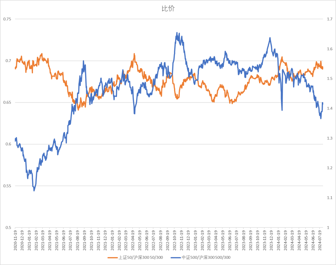 中证500与沪深300的比值反弹,上证50与沪深300比值小幅回落。