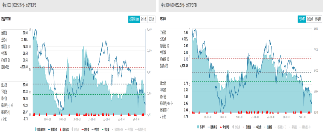 中证1000PE注册制改革以来分位点22%,PB分位数0%,估值低位。