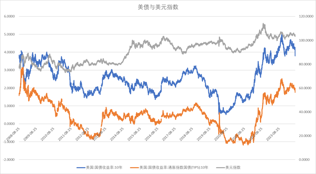 美十年期国债利率大幅下行到3.8%,实际利率下降到1.76%以下,美元下跌。